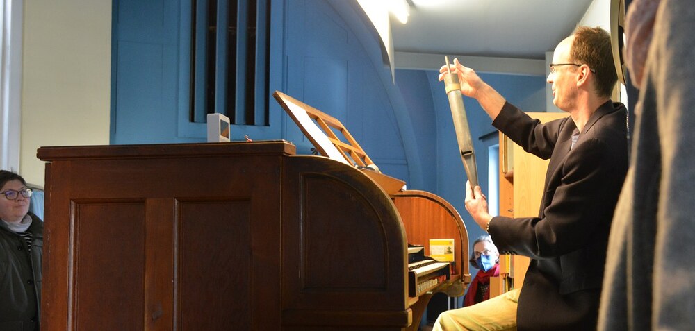 Wie groß ist die kleinste Pfeife der Orgel?“ fragt Pommer in die Besucherreihen. „Zwei Zentimenter rät ein interessierter Besucher. Johannes Pommer antwortet: „Sogar noch kleiner 1 cm, der höchste Ton der Orgel. Für die Kenner ist das eine G4." Der tiefste Ton der Orgel befindet sich auf 32 Hz und ist für uns Menschen gerade noch hörbar. Johannes Pommer ist in seinem Element. Flink hüpfen die Finger der linken Hand zwischen den beiden Manualen hin und her während die rechte Hand das entsprechende Register auswählt. Dazu agieren beide Füße spielerisch zwischen den Pedalen, die für den vollen Baßklang verantwortlich sind. Die BesucherInnen staunen, dass die Orgelpfeifen ein ganzes Orchester klanglich nachahmen können: es ertönen Streicher wie etwa der weiche Klang der Gambe, etliche Bläserinstrumente und eine Fülle von Flötenklängen. Je nach gewähltem Register variiert der Klang und der Organist ist sozusagen der Stimmungsmacher. So schön der Platz auf der Empore ist, die Fülle oder Feinheit des Klanges lässt am besten im Kirchenraum erleben. Wie weiß Johannes Pommer, ob der Klang im Raum zu laut oder vielleicht zu leise ist? Fragt eine Besucherin. "Hier gibt es eine Faustregel für den Gemeindegesang. Solange man die Menschen noch singen hört, ist die Orgel nicht zu laut." Zum Abschluss der Orgelführung erhalten wir noch einen Blick ins Innenwerk der Orgel und freuen uns über eine musikalische Darbietung.
