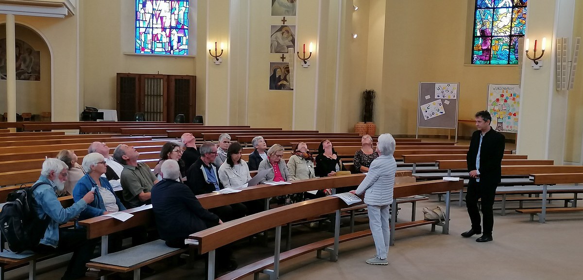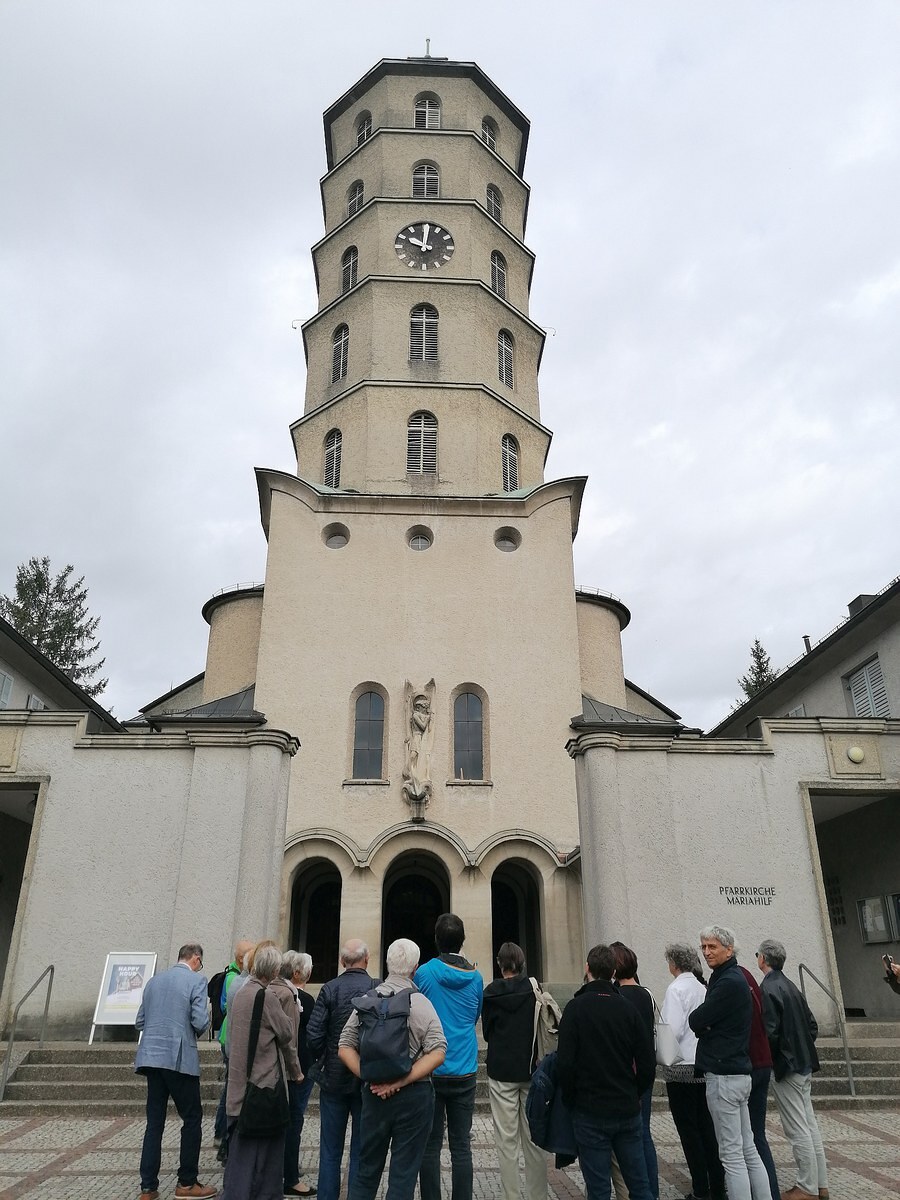 Die über 60 Teilnehmer:innen wurden in drei Gruppen aufgeteilt. Hans Hotz erzählte vor der Kirche die Entstehungsgeschichte der Kirche und das Gesamtkonzept des Gebäudekomplexes. Im Innenraum erklärte die erfahrene Kirchenführerin Katharina Hotz die vielfältige Symbolik der Elemente in der Kirche und die Überlegungen beim Umbau durch Architekt Purin in den 80er Jahren. In der Michaelskapelle schließlich stellte Architekt Martin Cukrowicz seinen Entwurf für eine Neugestaltung der Kapelle vor, mit dem er vor neun Jahren den ersten Preis beim Wettbewerb unserer Pfarre gewonnen hat.