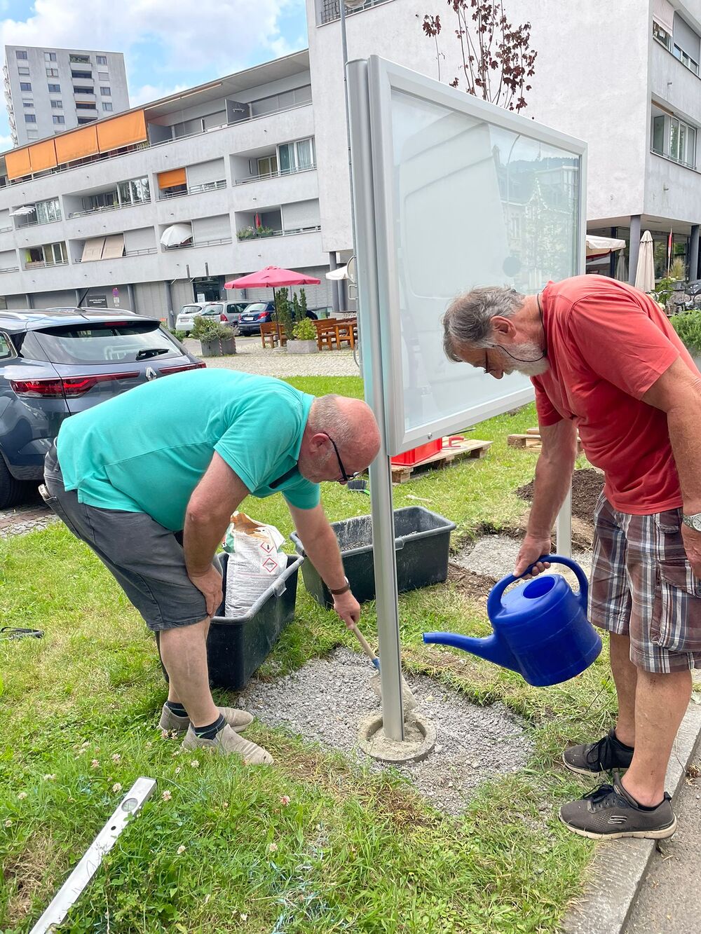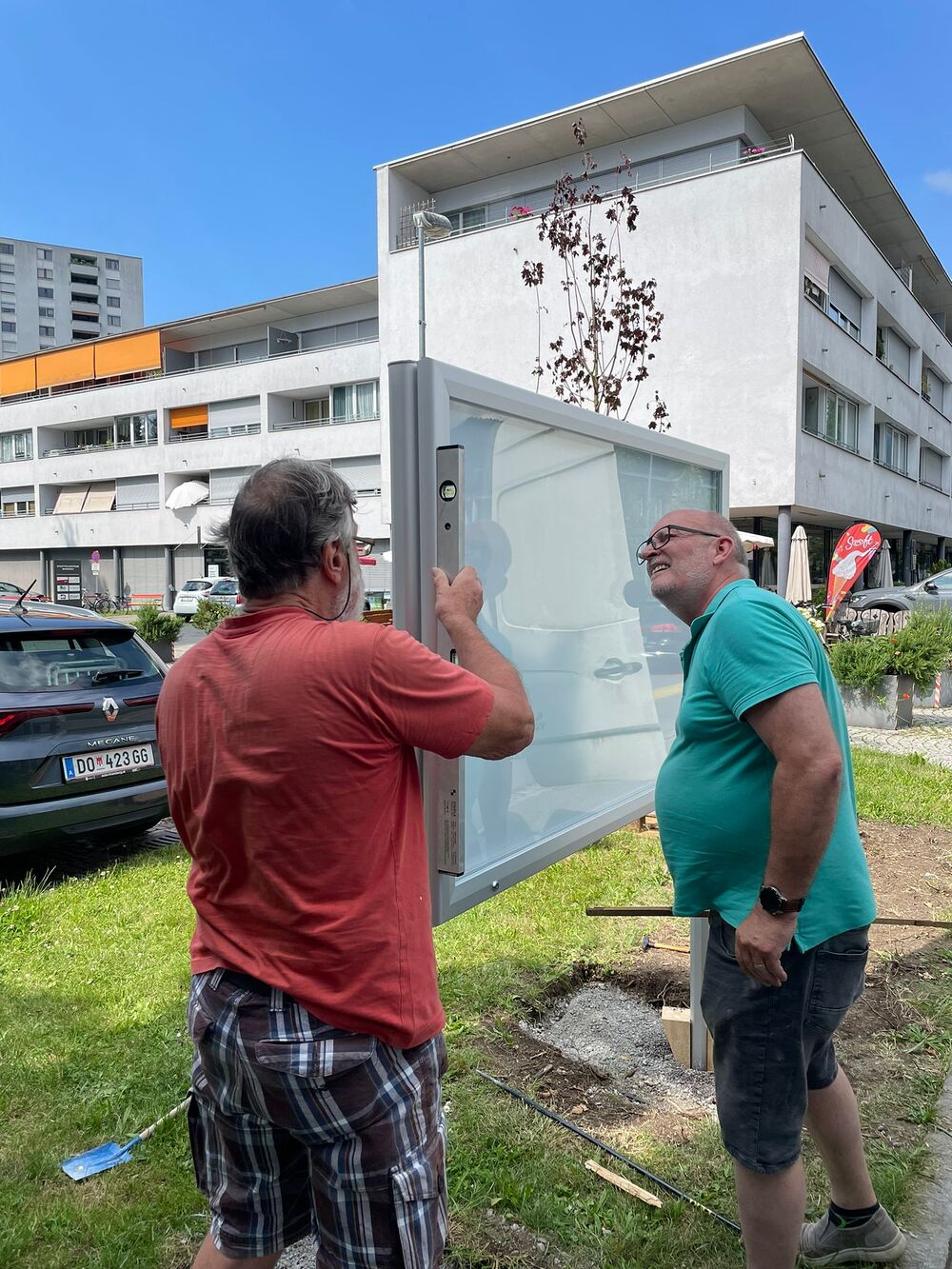 Im Zuge der Umbaumaßnahmen in der Mariahilfstraße haben Gerhard Blematl und Wolfgang Schiemer am 25. Juni diesen neuen Schaukasten aufgestellt.