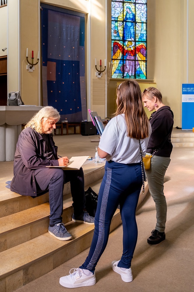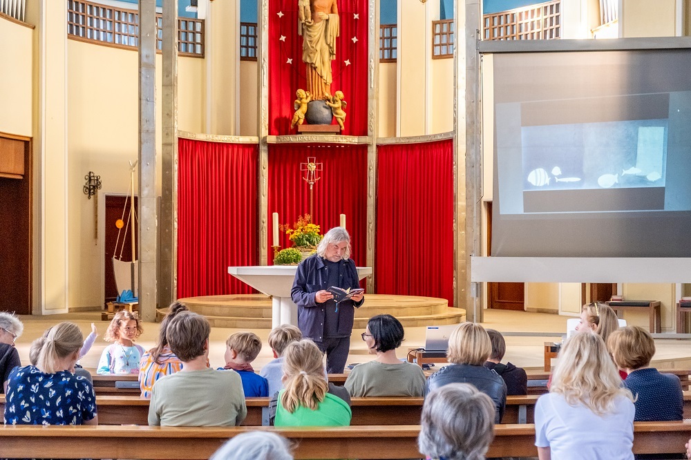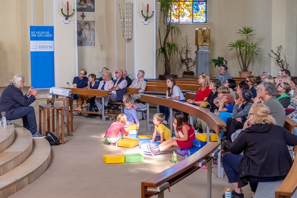 Die kleinen und großen Besucher:innen lauschten verzaubert und gespannt den Geschichten und freuten sich über die persönlichen Widmungen, die ihnen Heinz Janisch in ihre neu gekauften Bücher schrieb. | Thomas Berger-Holzknecht