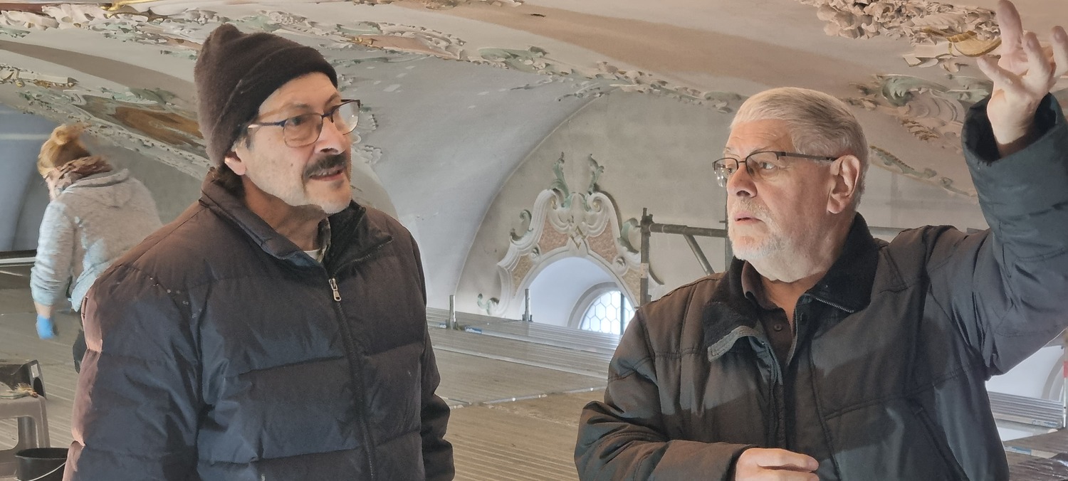 Von der Gruft und ihren Priestergräbern, von der neu eingegossenen Betondecke und ihrem Darunter bis über das Gerüst hinauf zu den Deckengemälden des Kirchenschiffes, von den Überlegungen des Restaurators und dem feinen Strich der Kirchenmalerinnen wird hier erzählt. Wer gut zu Fuß ist und die vielen Stufen nicht scheut, wird belohnt mit einem Blick ins Kirchendach und kommt schließlich ganz hinauf in den Turm.