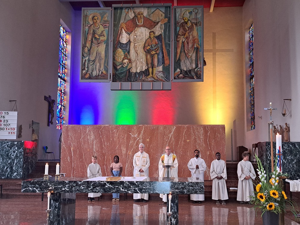 Im festlichen Gottesdienst, bei dem auch eine Ministrantenaufnahme stattfand, hielt Bischofsvikar Msgr. Rudolf Bischof eine feierliche Festpredigt. Für die musikalische Umrahmung sorgten die Singspatzen, das Chörle St. Gebhard sowie Mark Casey an der Orgel.
