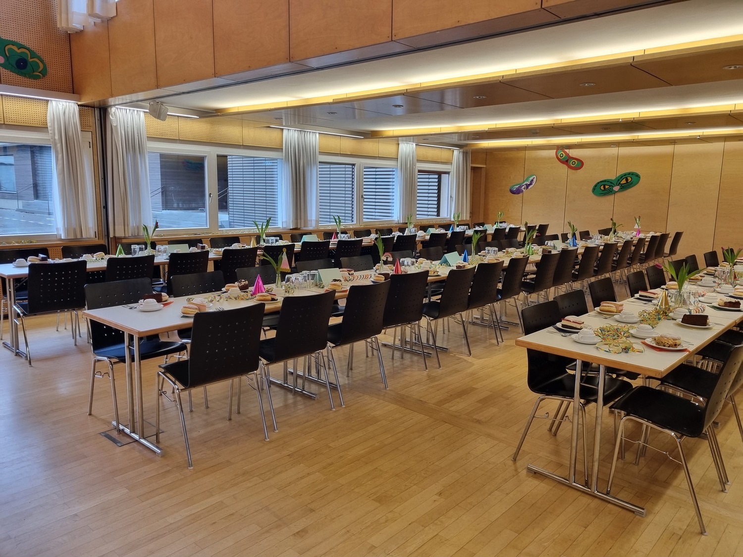 Der Saal eignet sich für einen Kurs, eine Turngruppe, ein Seminar oder eine Klausur, eine Eigentümerversammlung, eine Jahreshauptversammlung oder Ähnliches und kann auch geteilt werden.