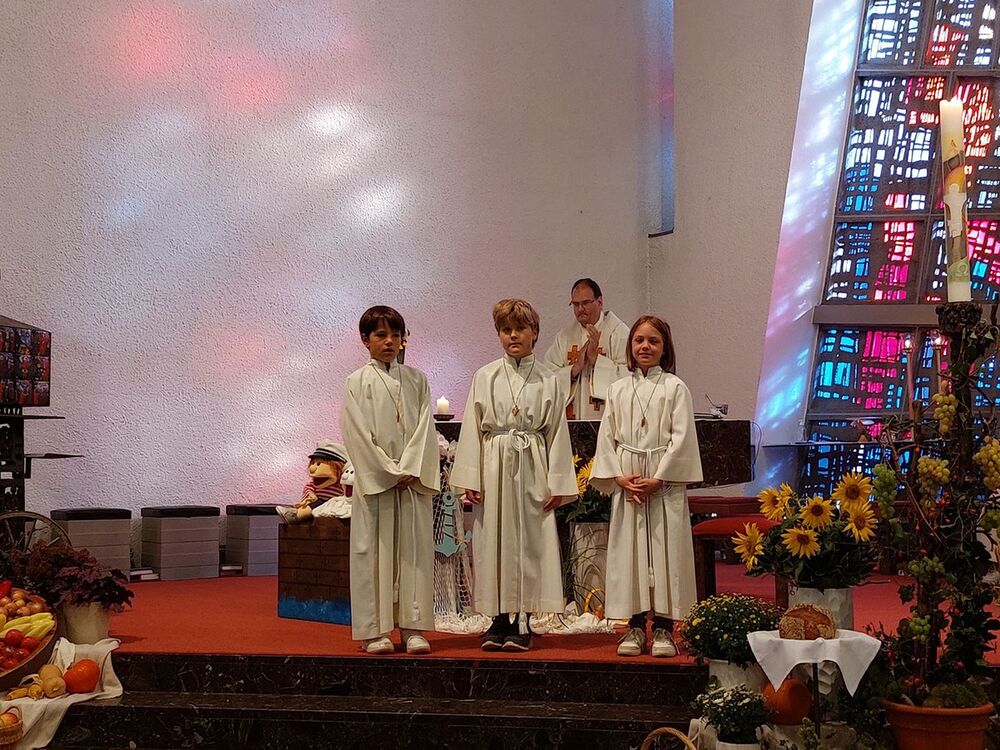 Bereits der Einzug war bunter als sonst, da viele Kinder mit ihren Erntekörbchen mitgelaufen sind. Gleich zu Beginn der Messfeier wurden unsere neuen Ministrant:innen, die ihren Dienst im Sommer begonnen hatten, offiziell aufgenommen.