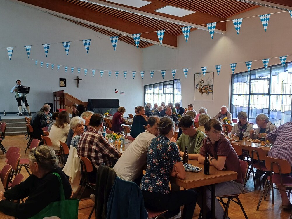 Im Anschluss an den Gottesdienst waren alle eingeladen, den schwungvollen Klängen von Werners Handorgel in den Pfarrsaal zum Oktoberfest zu folgen. Bei Weißwürsten, Brezen, Verhackertem, Bayrischem Bier, Spezi, Kaffee und Kuchen ließen wir es uns gut gehen.