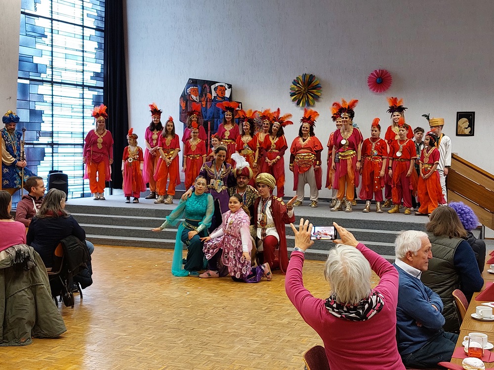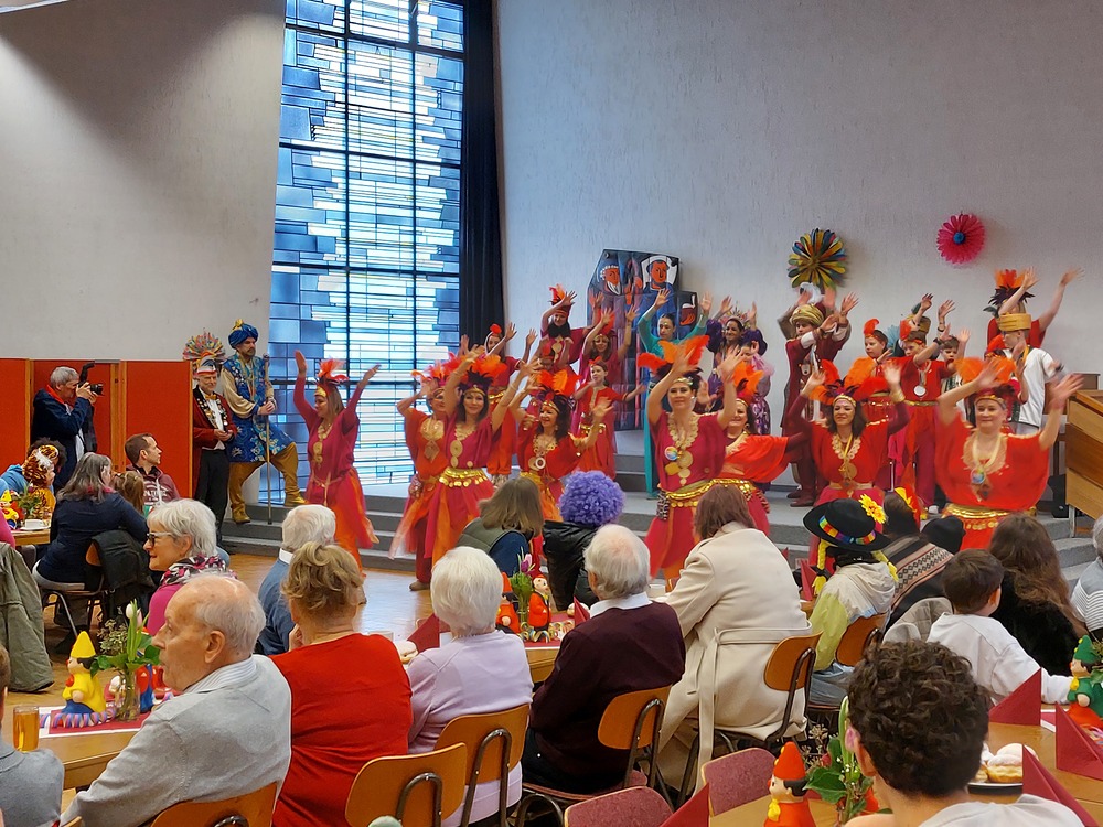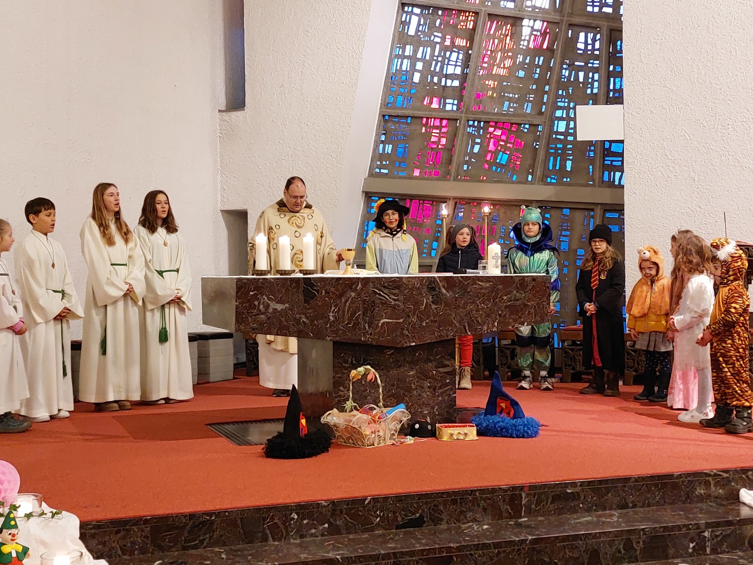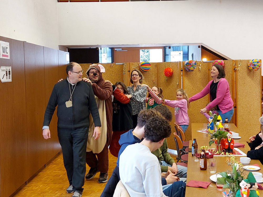 Nach der Messe waren alle zu einem Faschingspfarrcafé in unseren Pfarrsaal eingeladen. Das Bregenzer Prinzenpaar kam mit seinem Gefolge auf Besuch und brachte neben feinen Krapfen auch ganz viel Faschingsfeeling mit. Nicht nur mit ihrer Tanzeinlage konnten sie das Interesse unserer Pfarrcafébesucher:innen wecken, auch mit ihren wunderschönen und prunkvollen Kostümen zogen sie regelrecht alle Blicke auf sich. Ein sehr gelungener Auftritt und sehr leckere Krapfen!! Herzlichen Dank! Am letzten Wochenende im Fasching ministrierten wieder wie schon in den Jahren zuvor unsere Ü30-Maxis. Ein sehr ungewöhnliches Bild, sind wir sonst doch unsere engagierten Minis gewohnt!