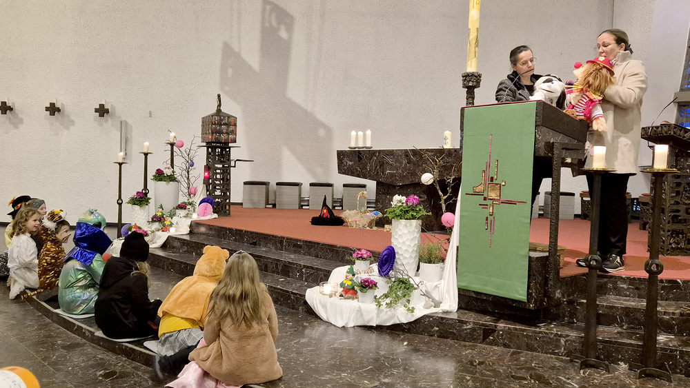 Große und kleine Mäschgerle waren herzlich willkommen! Fasti ging den großen Fragen nach, was die Seele in uns eigentlich sei, ob Gott in uns eine Wohnung habe, ob er uns immer liebhabe und wofür das Beten eigentlich nützlich sei. Viele Fragen, die mit sehr viel Liebe und Einfühlungsvermögen von unserem Kirchengeist geduldig beantwortetet wurden. Vor allem unsere kleinen Besucher:innen waren sichtlich begeistert von Fasti und Geist, durften sie doch mitten im Spiel der beiden dabei sein.