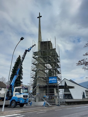 Aufgrund der bei Betonbauwerken erforderlichen Wartungsintervallen ist es jetzt höchste Zeit, Instandhaltungsmaßnahmen zu ergreifen und das Bauwerk für die Zukunft zu sichern. Sowohl am Kirchturm als auch an der Fassade der Kirche, des Pfarrhauses und des Pfarrsaals werden Sanierungsarbeiten durchgeführt.