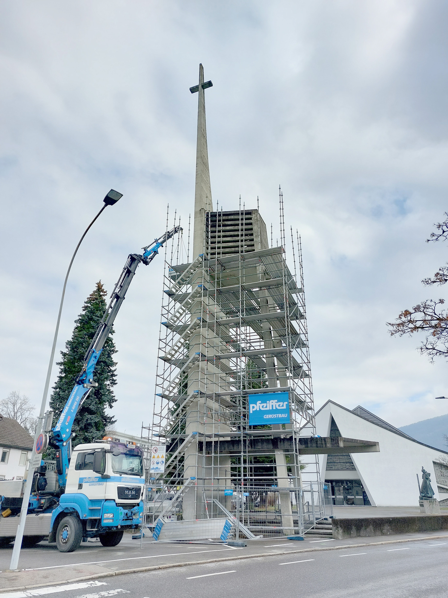 Aufgrund der bei Betonbauwerken erforderlichen Wartungsintervallen ist es jetzt höchste Zeit, Instandhaltungsmaßnahmen zu ergreifen und das Bauwerk für die Zukunft zu sichern. Sowohl am Kirchturm als auch an der Fassade der Kirche, des Pfarrhauses und des Pfarrsaals werden Sanierungsarbeiten durchgeführt.