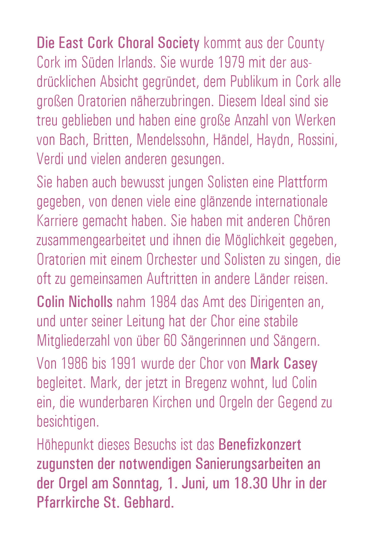 Von 1986 bis 1991 wurde der Chor von Mark Casey begleitet. Mark, der jetzt in Bregenz wohnt, lud Colin ein, die wunderbaren Kirchen und Orgeln der Gegend zu besichtigen.