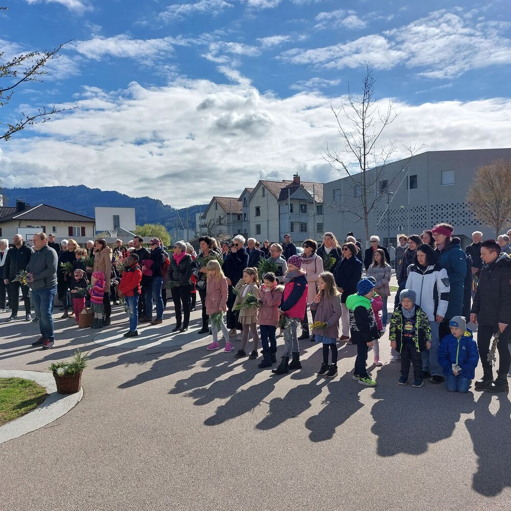 Messfeier mit Segnung der Palmzweige im Hof der Mittelschule Schendlingen, Prozession zur Kirche, Kinderpassion mit den Schüler:innen der 1. und 2. Klassen der VS Schendlingen