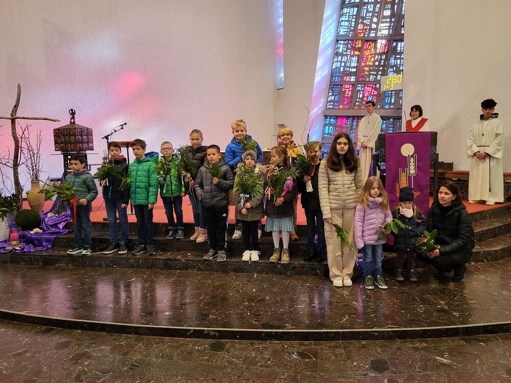 Messfeier mit Segnung der Palmzweige vor der Kirche